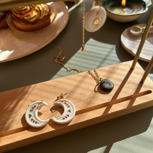 LĂ©gĂšres et dĂ©licates, ces boucles d'oreilles sont façonnĂ©es Ă  la main en porcelaine, puis Ă©maillĂ©es et cuites Ă  haute tempĂ©rature (env. 1250 °C). Une fine touche d’or vient souligner leur Ă©clat naturel.