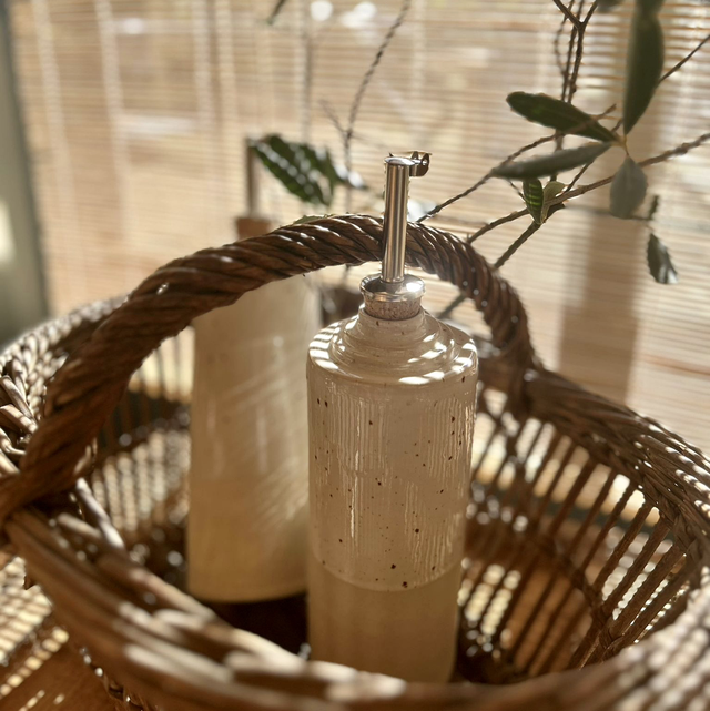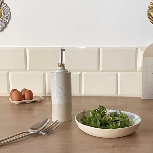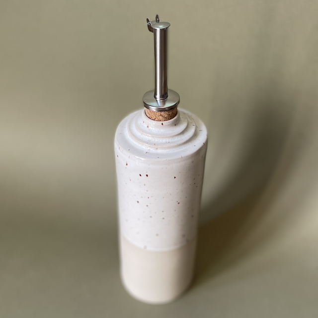 Huilier façonné à la main, en grès chamotté, puis émaillé et cuit à haute température (env. 1250 °C).