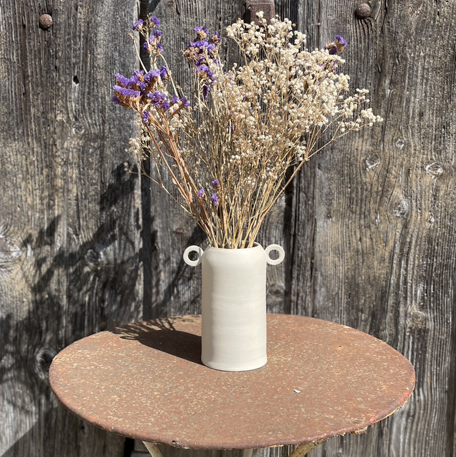 Vase façonné à la main, en grès chamotté, puis émaillé et cuit à haute température (env. 1250 °C).