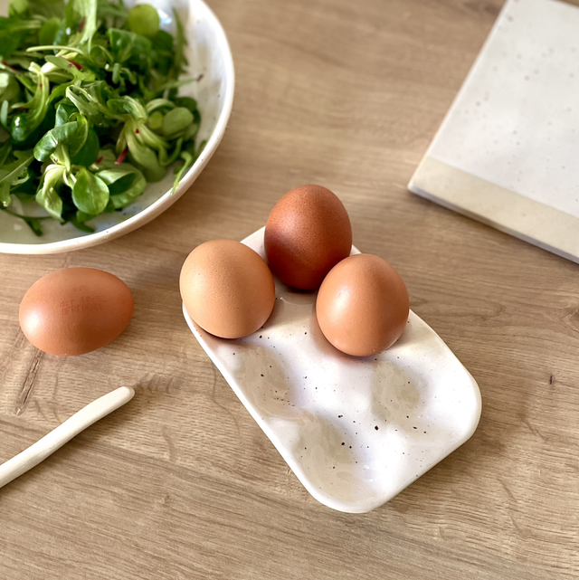 Support à œufs façonné à la main, en grès chamotté, puis émaillé et cuit à haute température (env. 1250 °C).